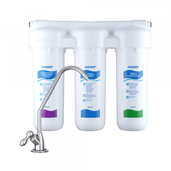 Обратноосмотические фильтры используются для абсолютной защиты от накипи, т.к. полностью устраняют соли жесткости из воды.нетЧисло ступеней очисткиКартриджи последовательно очищают воду и от видимых примесей, и от растворенных. Первый картридж задерживает более крупные частицы, а каждый последующий - более мелкие. Чем больше ступеней - тем лучше фильтр очистит воду: поймает более мелкие видимые частицы ржавчины, песка и ила, успеет захватить из воды максимум растворенных примесей - хлора, нитратов, тяжелых металлов и других.3МинерализацияПроисходит после финишной очистки воды. Необходима прежде всего в фильтре обратного осмоса, поскольку такой фильтр полностью устраняет из воды все примеси, в том числе минералы. Минералы добавляются в оптимальной концентрации - для пользы и привычного вкуса воды.нетПостфильтрацияФинальный этап очистки воды: картриджи постфильтрации удаляют самые мелкие механические частицы и кондиционируют воду, придавая ей более приятный вкус.нетНакопительная емкостьОбычно нужна в фильтрах обратного осмоса. Глубокая фильтрация требует времени. Чтобы Вам не приходилось ждать, пока вода наберется в чайник или кастрюлю, почти во всех моделях используется накопительный бак для чистой воды или другая емкость. В стандартном фильтре обратного осмоса под мойку воды в баке достаточно для семьи из 5-6 человек.нетФильтрующий модуль в комплектедаОтдельный крандаДавление в водопроводе не более, атмМаксимальное давление воды на входе в систему, при котором возможна стабильная работа фильтра.6,5Ширина, смОбратите внимание на габариты фильтра, и измерьте, сколько свободного пространства в предполагаемом месте установки.33,2Глубина, смОбратите внимание на габариты фильтра, и измерьте, сколько свободного пространства в предполагаемом месте установки.10,5Защита корпуса от гидроударовдаИсходная водаЖесткая вода – вода с избытком минеральных солей. От нее появляется накипь в чайнике, известковый налет на сантехнике и разводы на посуде. Мягкая вода – та, в которой мало минеральных солей. Нет накипи в чайнике и разводов на посуде. Фильтры для мутной воды и фильтры от ржавчины, как правило, имеют несколько стадий очистки и дополнительный полипропиленовый картридж. Он задерживает механические частицы ила, песка и ржавчины и защищает картриджи более глубокой очистки.мягкаяУстраняет мутностьМутность водопроводной воды может говорить о том, что в ней много мелких механических частиц. Важно, чтобы в фильтре был установлен дополнительные картридж механической предфильтрации (полипропиленовый) - он продлит жизнь остальным картриджам более тонкой очистки.нетУстраняет ржавчину, бурый осадокЛюбой фильтр под мойку удалит из воды крупные и мелкие частицы ржавчины. Некоторые фильтры имеют повышенный ресурс по железу: они дольше служат в такой воде, поскольку лучше подходят для удаления из воды железа и механических частиц ржавчины.даЗащита от бактерийВсе проточные фильтры в той или иной степени защищают от бактерий. Например, добавление серебра препятствует их размножению. Это стандартная степень защиты. Если в семье есть дети, пожилые люди или аллергики, воду рекомендуется обеззараживать, то есть полностью удалять микроорганизмы. Повышенную защиту от бактерий дают фильтры с половолоконной мембраной. Это пучок труб